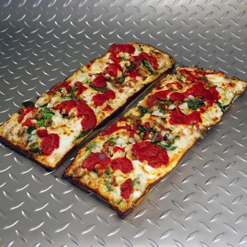 An 8" x 12" rectangular thick crust pizza. Toppings are placed directly on the dough, then covered with cheese all the way to the edges with sauce on top. Tasty buttery, garlicy, brown, crispy edges on all 8 pieces.