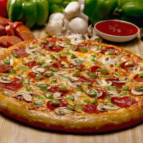 Large Mozzarella, pepperoni, ham, sausage, beef, mushroom, onion and bell pepper. Cal 227 - 321