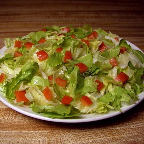Fresh lettuce or spinach or lettuce/spinach mix, tomato, onion, green pepper, mushroom, and black olive.