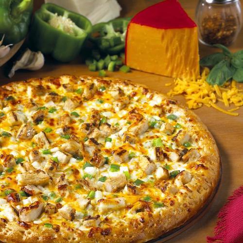 White sauce, mozzarella and cheddar cheeses, lots of fajita chicken breast, onion, and green pepper. Cal 99 - 604