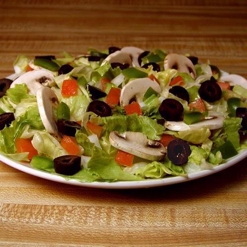 Fresh lettuce or spinach or lettuce/spinach mix, tomato, onion, green pepper, mushroom, and black olive.