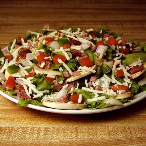 Fresh lettuce or spinach or lettuce/spinach mix, tomato, onions, green pepper, bacon, ham, mushroom, and cheddar cheese.